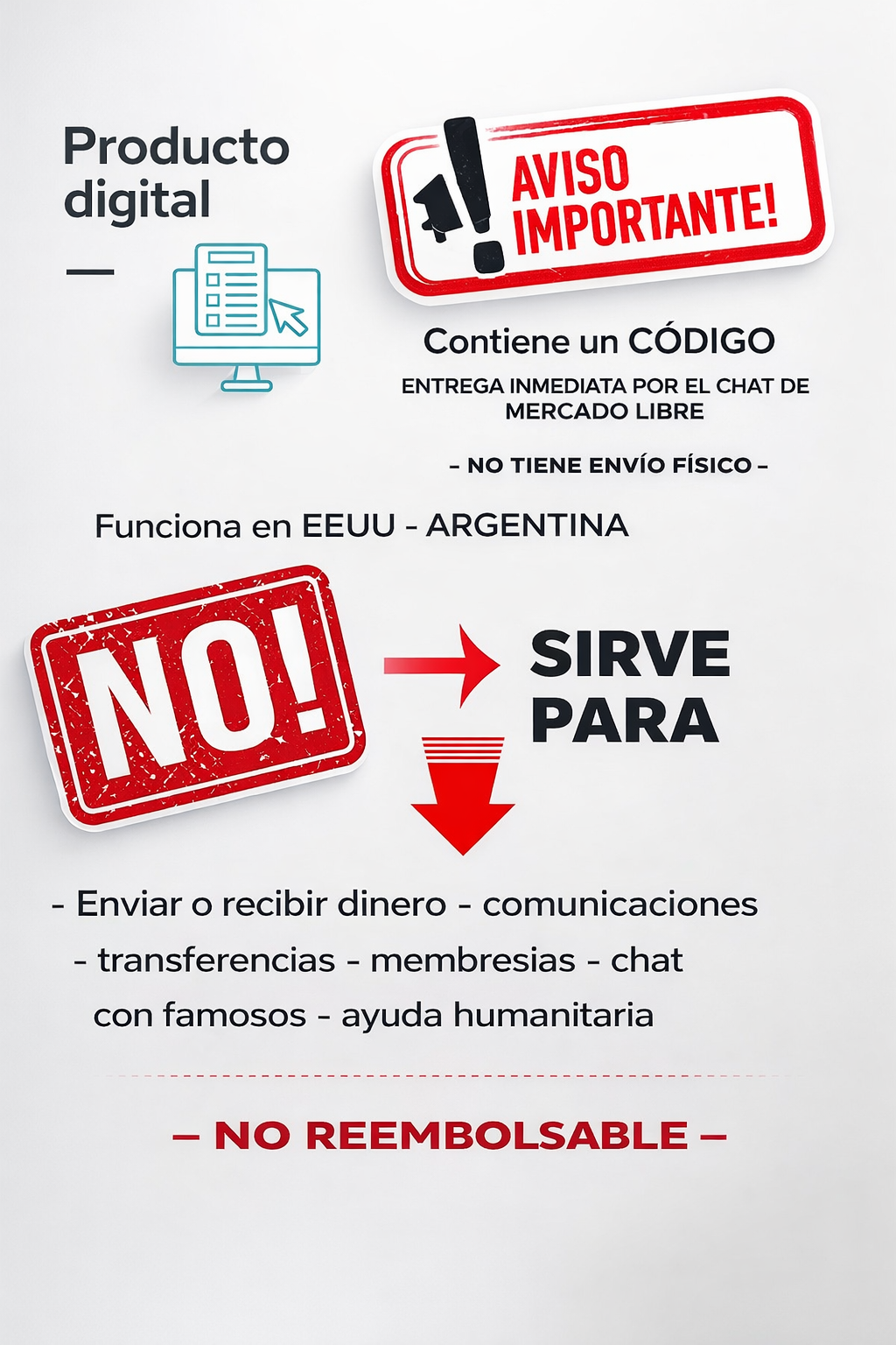 UNA VEZ ENVIADO EL CODIGO NO HAY REEMBOLSO, LEER BIEN LAS CARACTERISTICAS DEL PRODUCTO